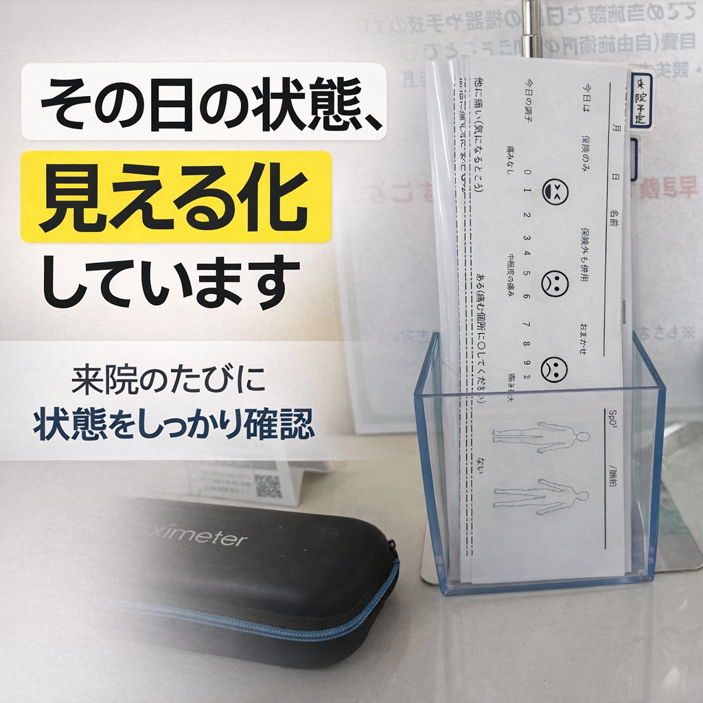 来院時に必ず「状態確認シート」を使って、今の身体の状態をチェックしています。