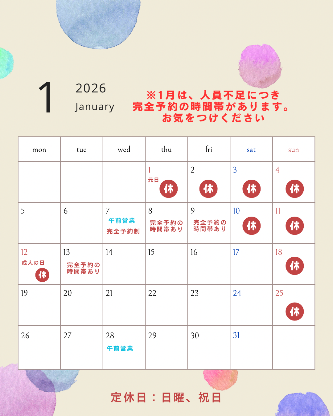※営業日・休診日の詳細は、下記のカレンダーをご確認ください。