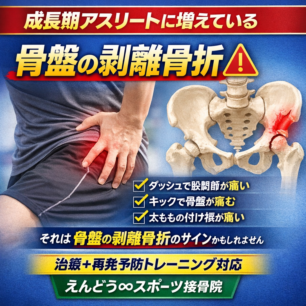 最近、部活動やスポーツをしている**中学生・高校生に多い「骨盤の剥離骨折」**の相談が増えています。